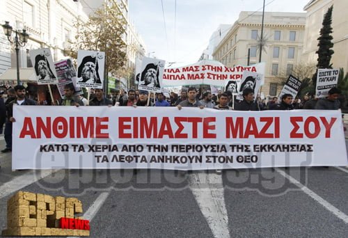 Με κύρια συνθήματα: ” Άνθιμε είμαστε μαζί σου”, “Δίπλα μας στην Χούντα – Δίπλα μας στην κρίση” και “Κάτω τα χέρια από την περιουσία της Εκκλησίας, τα λεφτά ανήκουν στον Θεό”, χιλιάδες διαδηλωτές εκφράζουν την αγανάκτησή τους για την άδικη αντιμετώπιση που δέχεται η Εκκλησία από την κυβέρνηση.