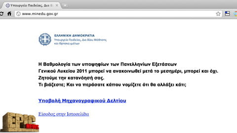 Ειρωνία κα χλευασμός του Υπουργείου Παιδείας προς τους χιλιάδες μαθητές και γονείς, οι οποίοι βλέπουν την υπομονή τους να εξαντλείται. Γύρω στις 09:30 το πρωί στην ιστοσελίδα του Υπουργείου Παιδείας http://www.minedu.gov.gr ανακοινώθηκε ότι τα αποτελέσματα μπορεί να ανακοινωθούν μετά το μεσημέρι, αλλά μπορεί και όχι.
